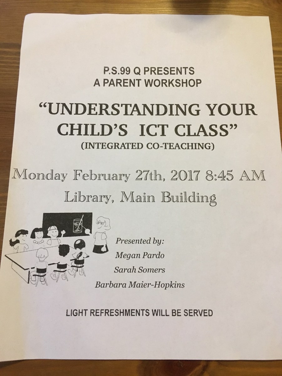 NoticesICT Parent Workshop There’s a parent workshop about understanding your child’s Integrated Co-Teaching (ICT) class on 2/27/2017. Let us know how it goes and if you’d like to hear something similar at a PA meeting. Share this: Click to share on X (Opens in new window) X Click to share on Facebook (Opens in new window) Facebook Click to email a link to a friend (Opens in new window) Email Like Loading...
